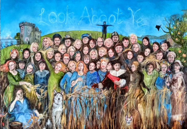 Alexander Moffat has observed of this Look Aboot Ye painting: "In this hugely ambitious painting they are placed in a landscape that relates to Karen’s earlier theme of the witch-trials that took place in the 16th and 17th centuries in the Forth Valley. The recent and distant pasts are united in Karen's visionary work".