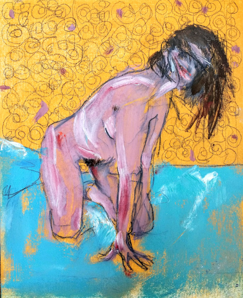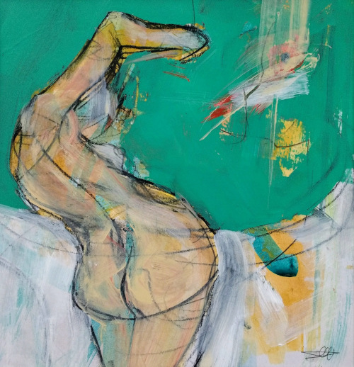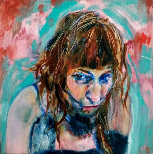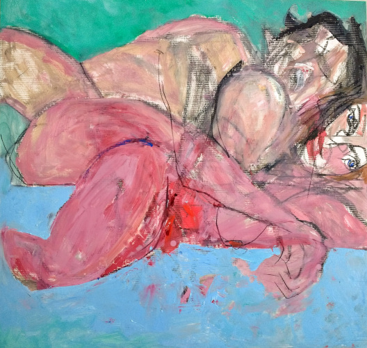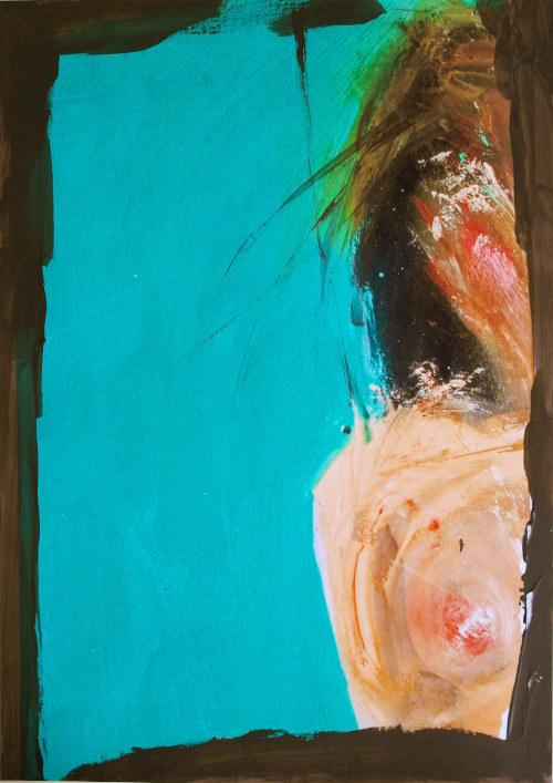 In Western painting tradition, women are generally objectified, cloaked in a serene blue, a life-giving red or fleshed-out in pinks and browns, to satisfy the male gaze. In these paintings, by contrast, the figure as female protagonist, while remaining constrained by fleshy hues, often butchered, forces a psychic extreme of liberated expression, energised by viridian.